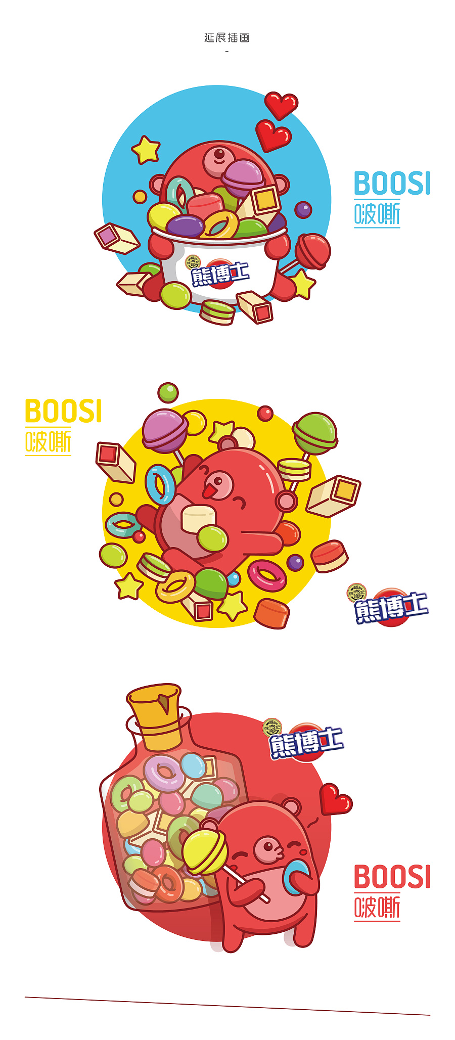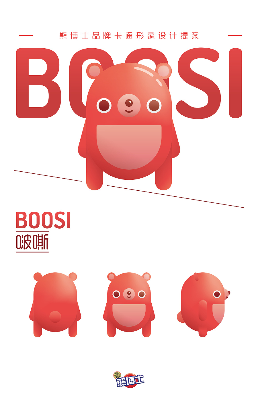 1912編者為你提供熊博士品牌卡通形象設(shè)計提案。啵嘶(Boosi),設(shè)定為熊博士的學(xué)生,一只年輕活力調(diào)皮戲多可愛好耍熱情的圓嘟熊,喜歡分享糖果并傳遞快樂。啵嘶造型簡單/規(guī)矩/個性,醒目的熱情紅,從而延展性高,可塑性強,得到特色記憶點