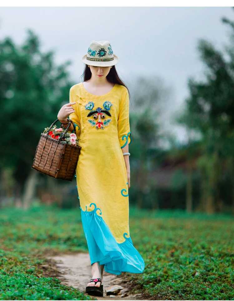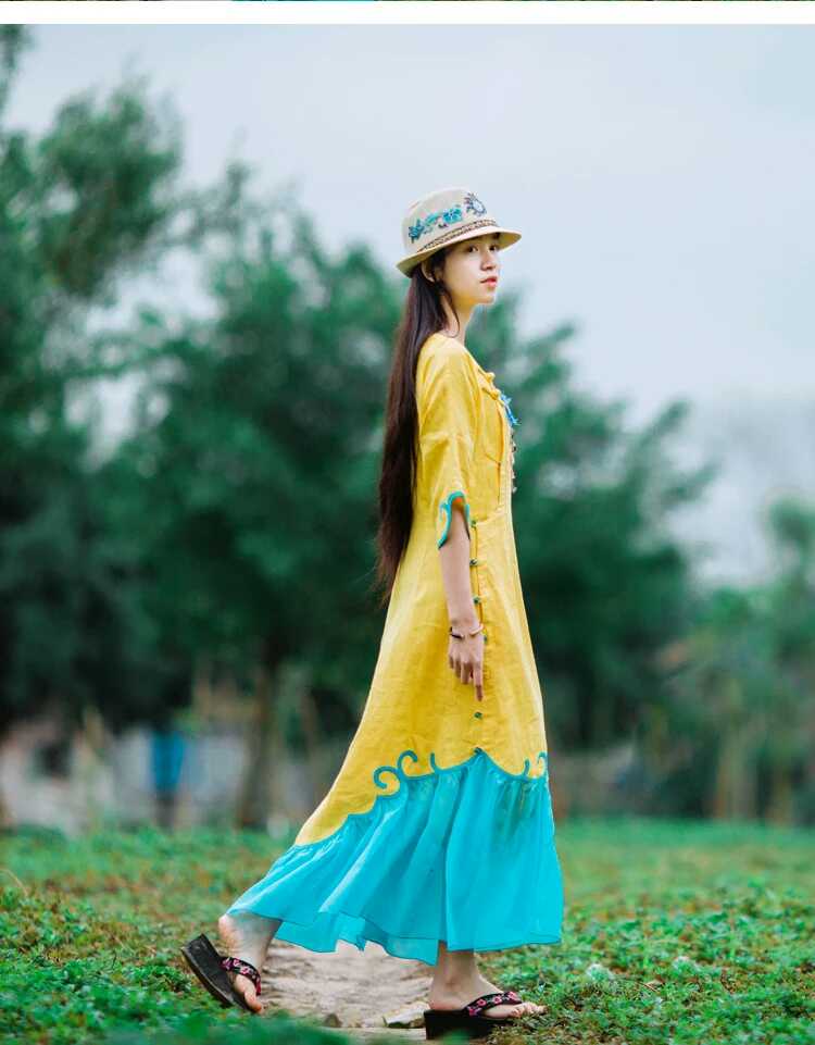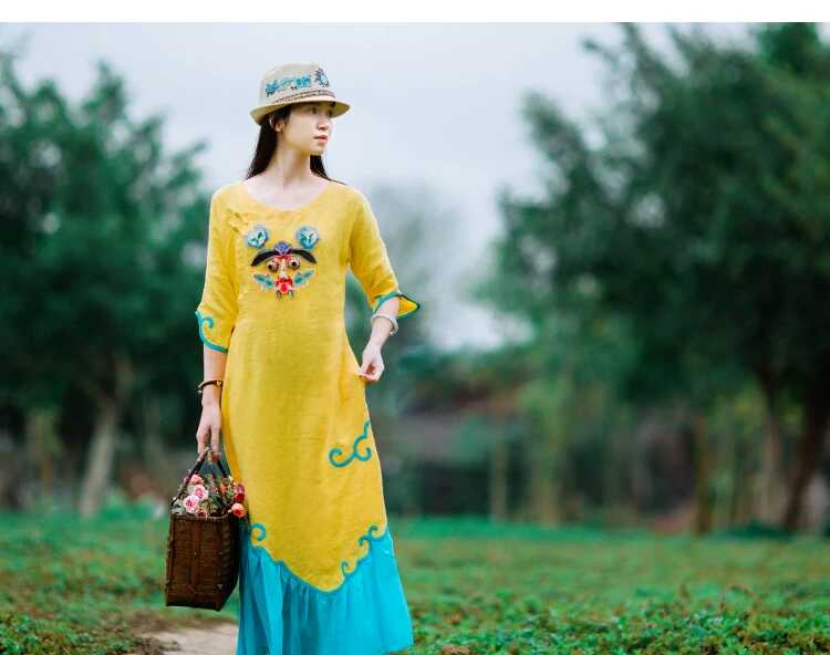 產(chǎn)品設(shè)計理念:旗袍是我一直鐘情的,一直也想擁有一款有趣而不失得體的旗袍款,改良版旗袍滿足了我這種需求,明媚的黃色,唯美的湖藍色,碰撞出視覺色彩,虎頭刺繡躍然于胸前,帶著一份俏皮卻又不失民族風(fēng)韻味。不規(guī)則的袖口,隨性自然,純手工盤口,古典優(yōu)雅,裙擺飄逸靈動。攜著抹明亮的黃色,舞動在浪漫的季節(jié)里。