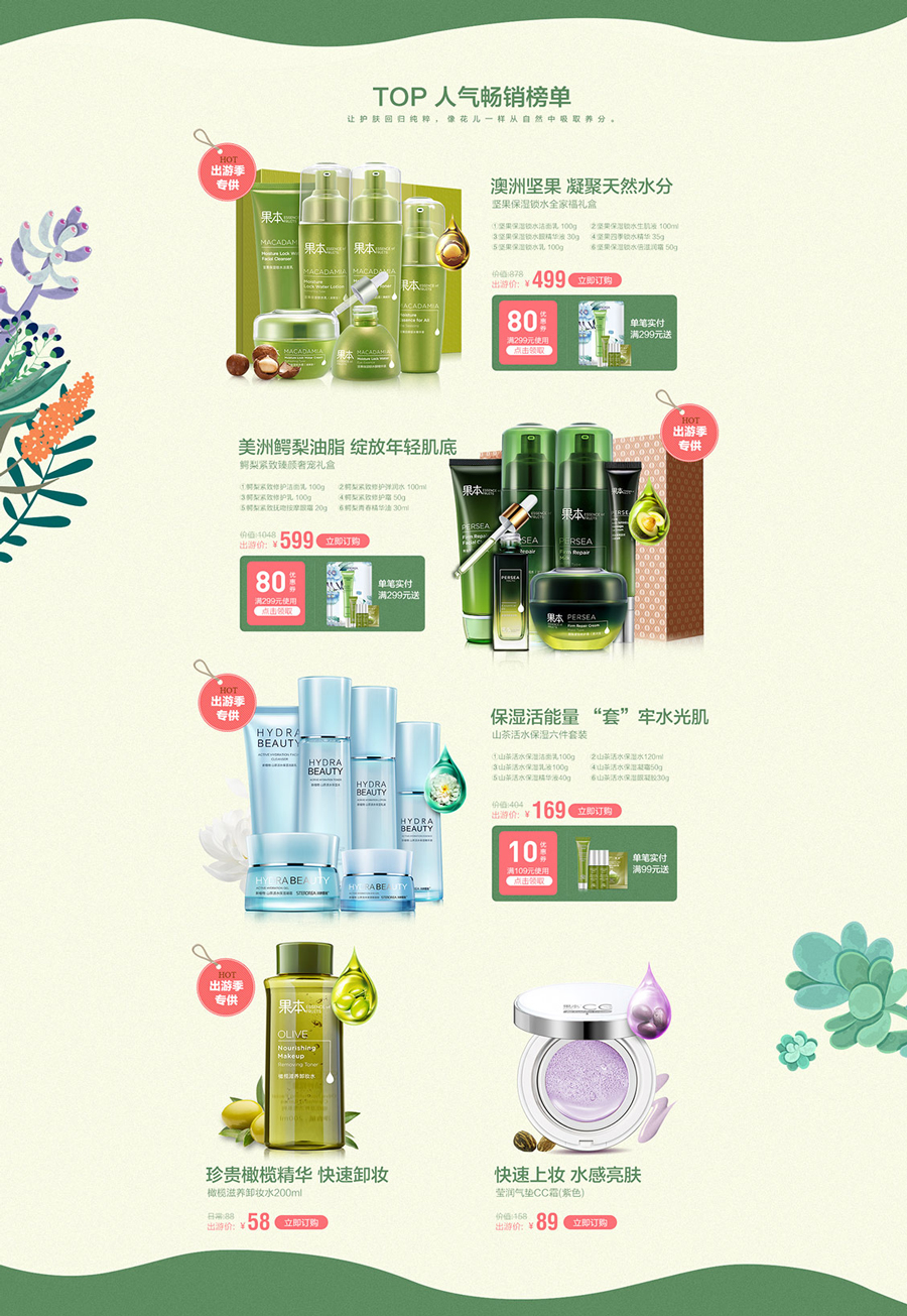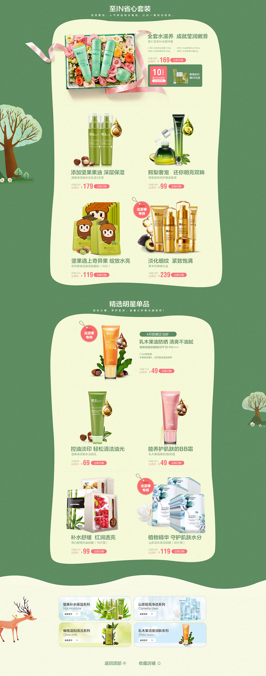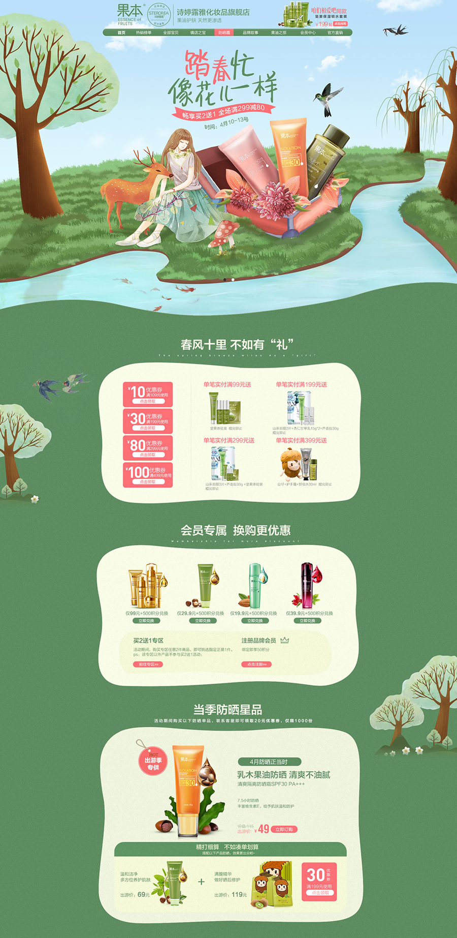 詩婷露雅果本專題頁面設(shè)計(jì)案例是由1912做的彩妝網(wǎng)店頁面設(shè)計(jì)案例之一。次頁面設(shè)計(jì)的活動是春季美妝產(chǎn)品活動。設(shè)計(jì)采用春景繪畫的方式來展現(xiàn)春季的主題。