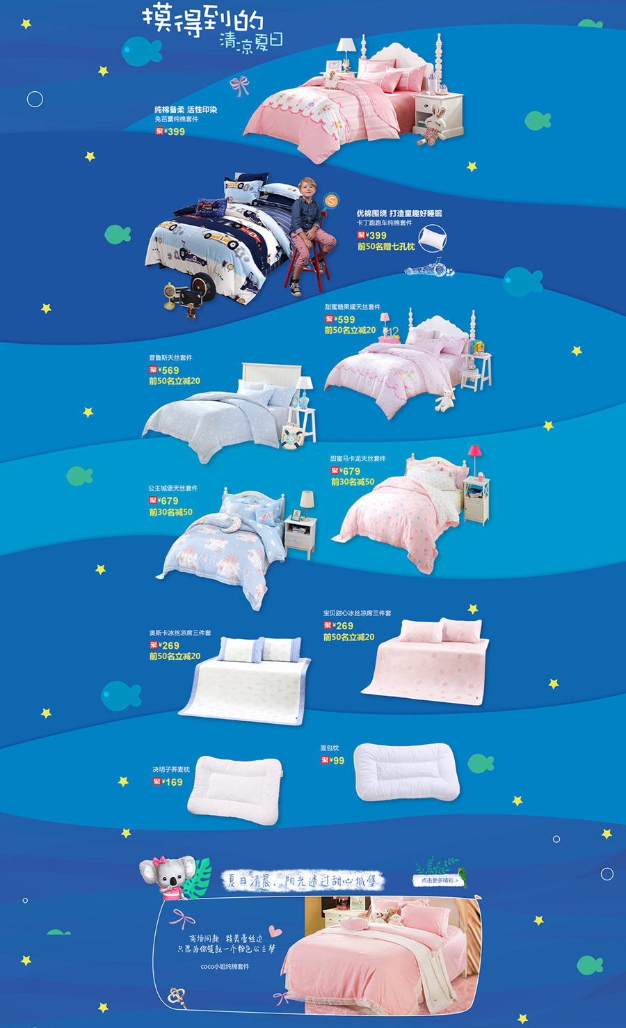 1912編者,為你推出夏季的頁面設(shè)計案例——夢潔寶貝家紡專題頁面設(shè)計案例?!奥吻鍥鱿囊埂睘橹黝},活動則是為夏季帶來一些清涼,“冰點入夏1折起”。次頁面也是為符合此主題,夏季中給人帶來清爽的感覺。并采用卡通風格。