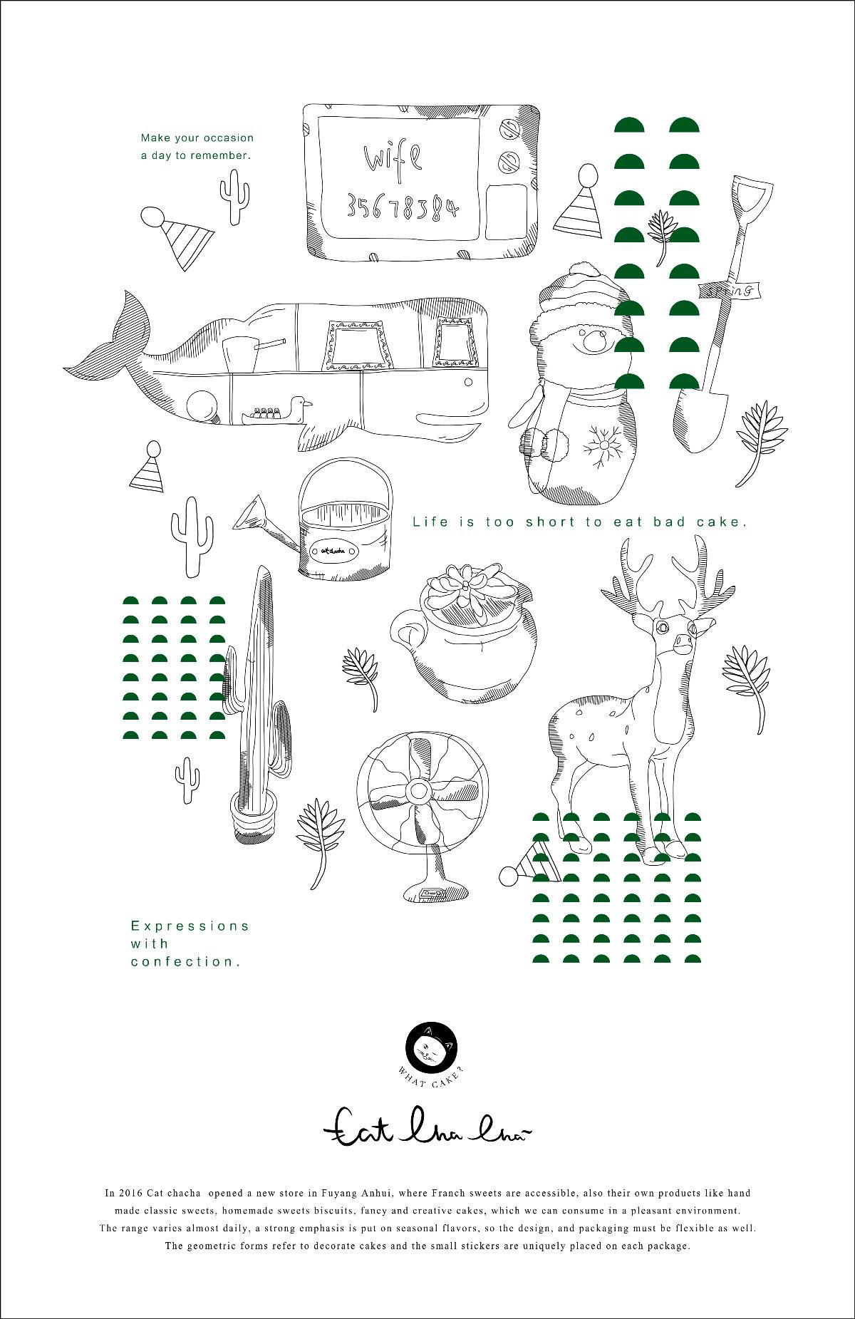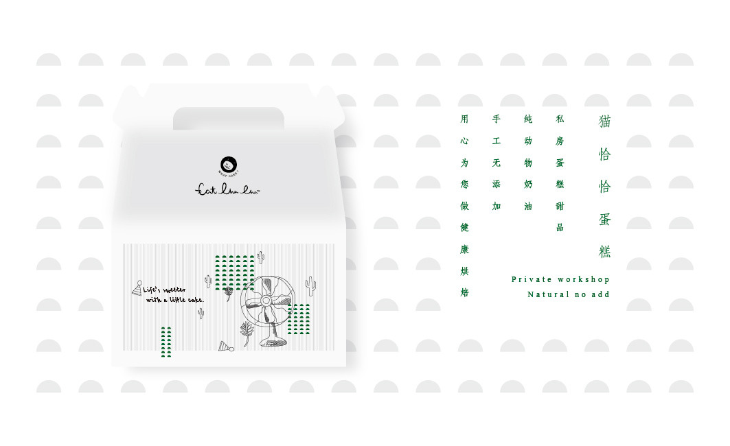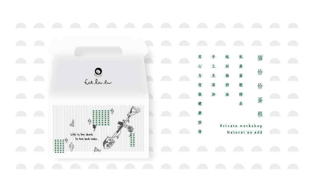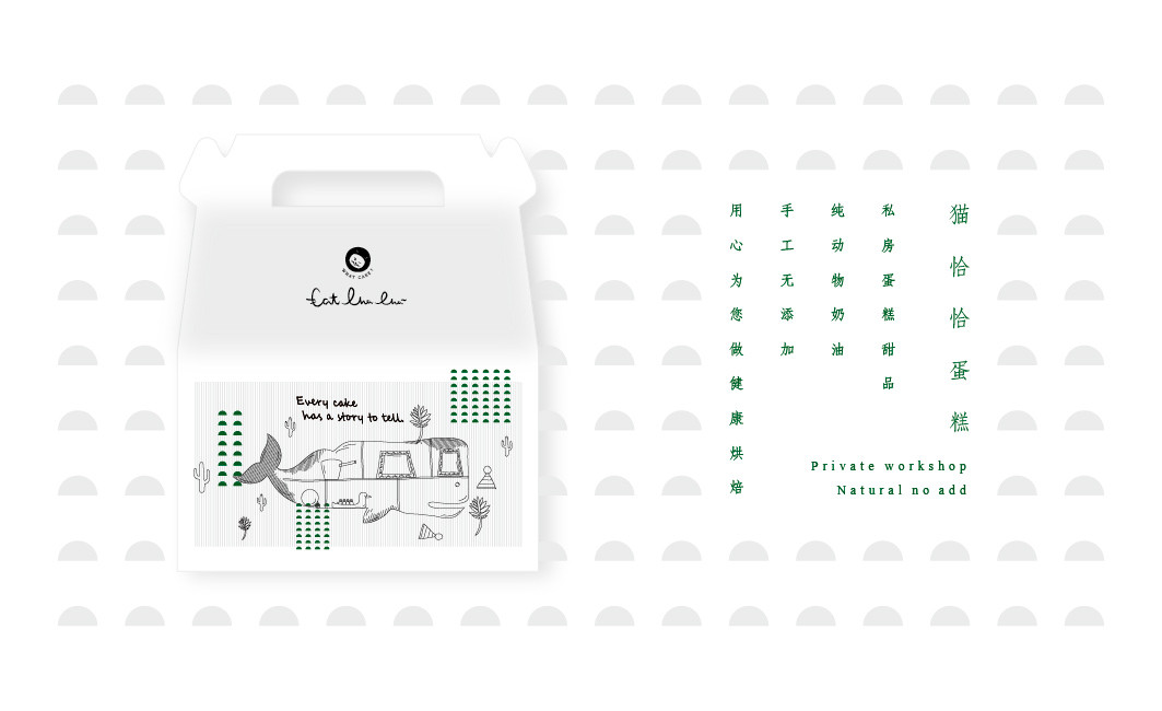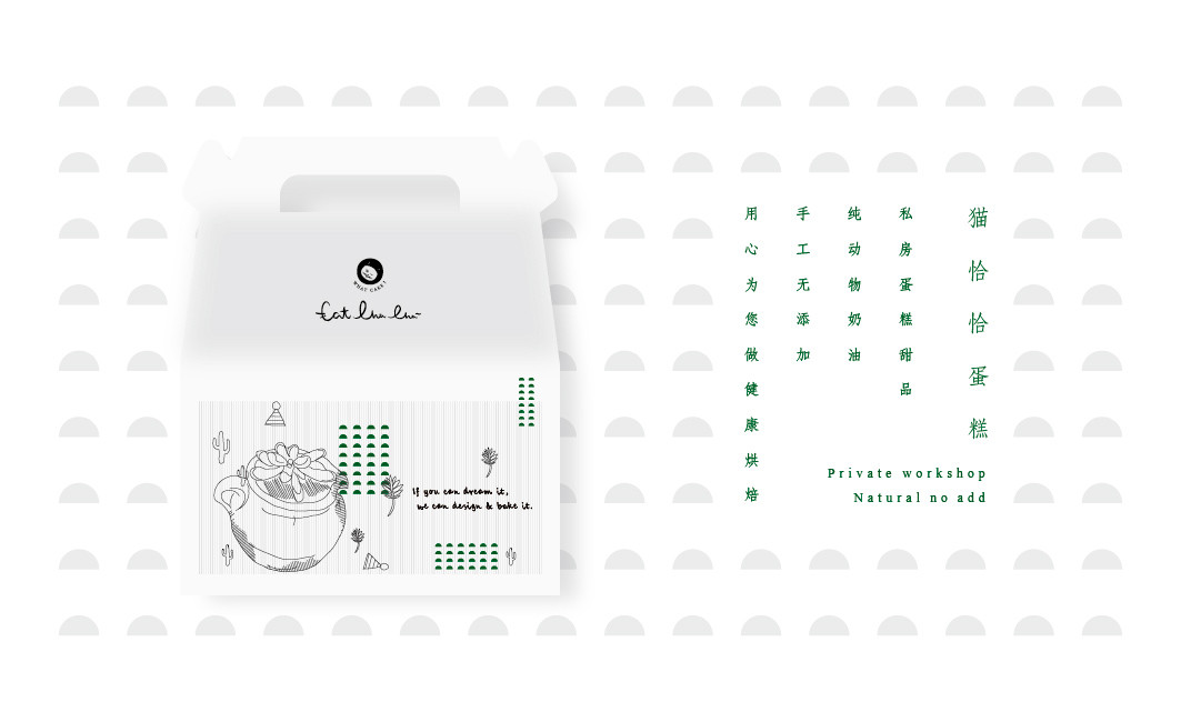 logo部分包含“catchacha”英文字母,是貓恰恰英文翻譯而來;客戶定位“私房蛋糕甜品,純動物奶油,手工無添加,用心為您做健康烘焙”。