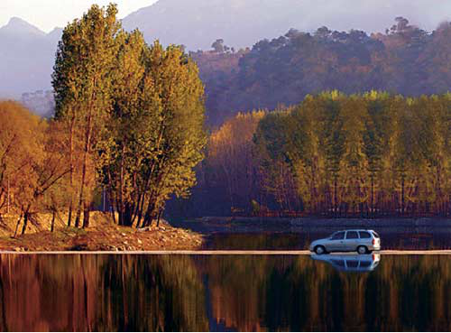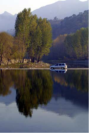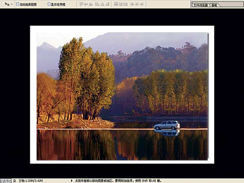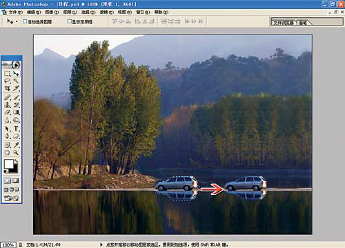 從圖3,可以看出汽車位置不當(dāng),基本構(gòu)圖符合井字形構(gòu)圖,那么我們把汽車挪個(gè)位置。方法是:用鋼筆工具按著汽車輪廓(包括水中倒影)繪制基本的封閉路徑,選擇該路徑層的同時(shí)按下Ctrl鍵,取得選區(qū)。復(fù)制,粘貼,并移至如圖所示位置。選擇復(fù)制圖章(Clone stamp)工具,按住Alt鍵,將圖章復(fù)制工具移至要復(fù)制的圖案(四周的湖面),此時(shí),放開Alt鍵,移動(dòng)鼠標(biāo),將原來位置的汽車及倒影替換為四周的湖面。(圖4/5/6)