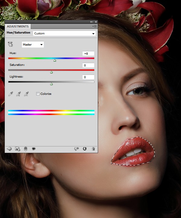 首先我們對嘴唇顏色進行修飾,使用多邊形套索工具(快捷鍵L)選擇出嘴唇,在圖層面板》新建調(diào)整層》選擇色相/飽和度,參數(shù)如圖(色相+8)。