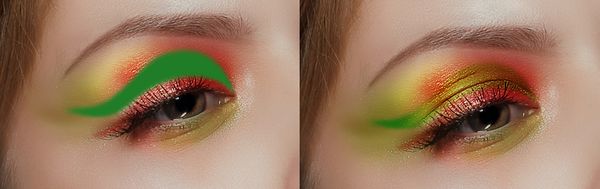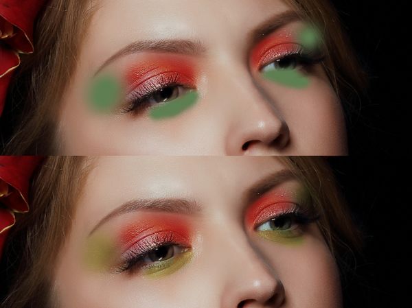 使用另一種顏色 ( #597540) 涂抹左眼的外緣,圖層模式改為柔光,透明度100%.