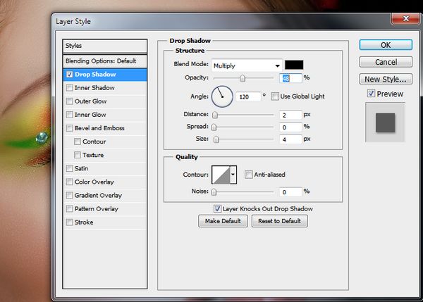 雙擊寶石層,彈出圖層屬性面板,設置投影,參數(shù)如圖。