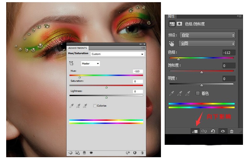 選中所有寶石圖層,按CTRL+G成組,將這個組群的模式設為正常,透明度100%,在圖層面板》使用調(diào)整圖層》色相/飽合度,調(diào)整寶石組(將調(diào)整層向下影響為僅針對寶石組,如下右圖)使其符合臉部的顏色。。