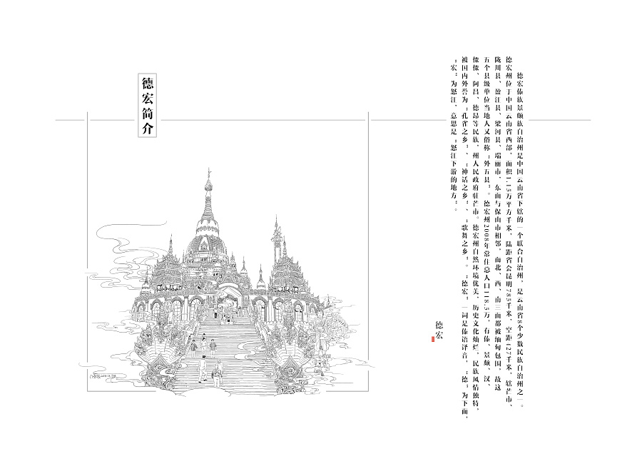 在構(gòu)建框架部分,本案以手繪技法為表現(xiàn)方式貫穿全局,圖文并茂,以景觀手繪的形式再現(xiàn)了充滿民族色彩的德宏。