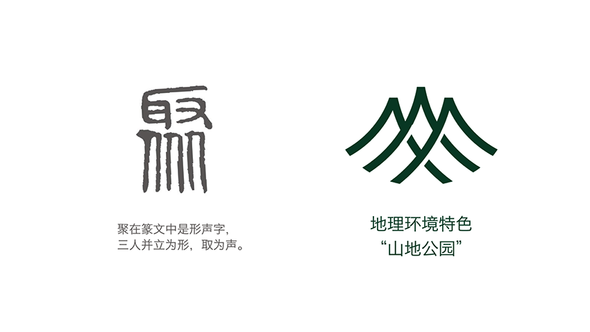 以“聚”為創(chuàng)意概念的則結(jié)合了人文與山水,并將其具象圖形化,整體視覺形象則以幾何線分割組合作為延伸設(shè)計。