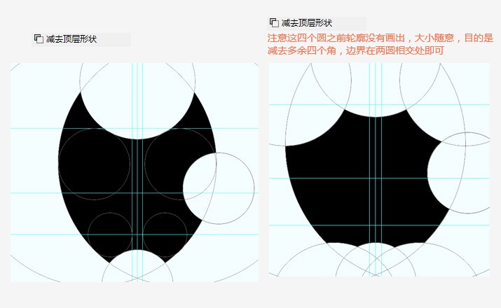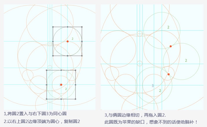 通過不同的圓相切,獲得標(biāo)志的各處曲線、弧度和轉(zhuǎn)折數(shù)據(jù),并證明這些數(shù)據(jù)的必要性和合理性。比如蘋果logo,缺口、葉子、上端凸起和下端凹進(jìn),相應(yīng)圓形直徑是一致的。