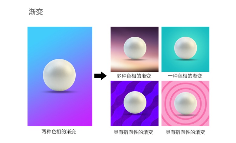 漸變的種類比較多,有一種色相的漸變,也有不同色相的漸變,同時(shí)漸變都是有指向性的特點(diǎn),所以對(duì)于有明顯方向指向性的圖案背景來(lái)說(shuō)也算是漸變。