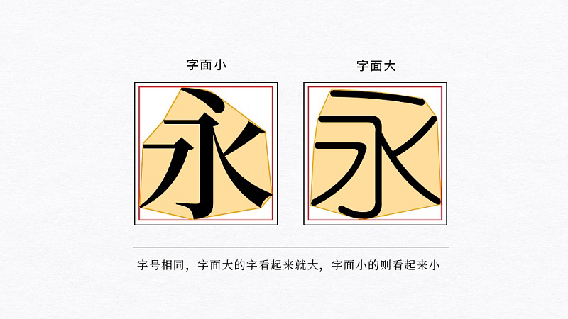 也就是說,在字面框不變的情況下,把字體設(shè)計(jì)的外表大就稱字面大,外表小則稱字面小。這就是同樣字號(hào)的字,有的字體看起來大而有的字體看起來小的一個(gè)重要原因。