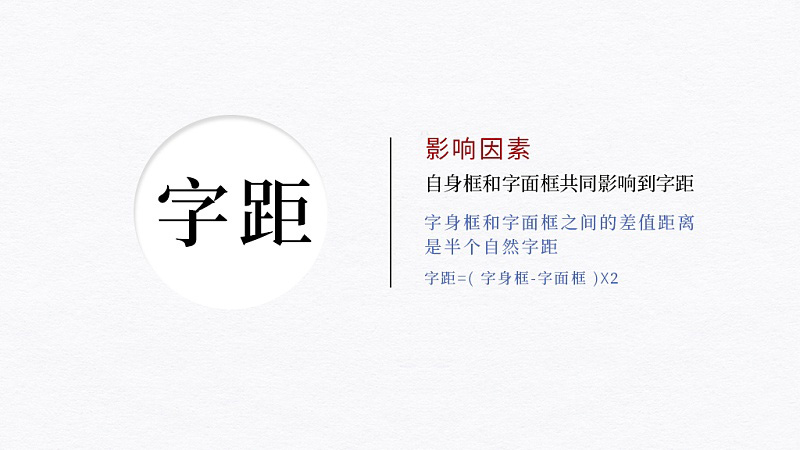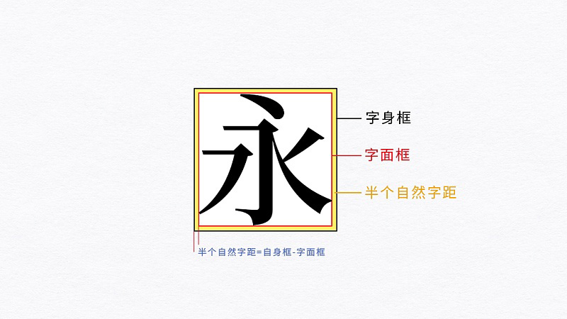 也就是說,自身框和字面框共同影響到字距。這也就是在字體設(shè)計(jì)中,字身框和字面框之間的差值距離是半個(gè)自然字距的原因!
