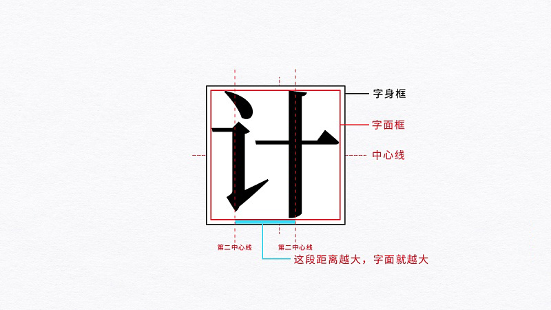 第二中心線理論:適用于形聲組合的漢字,取形旁和聲旁這兩個(gè)部件各自的豎直中心線,測(cè)量這兩條中心線間的距離,距離越大,字面就越大,反之,字面就越小。