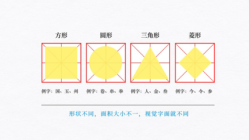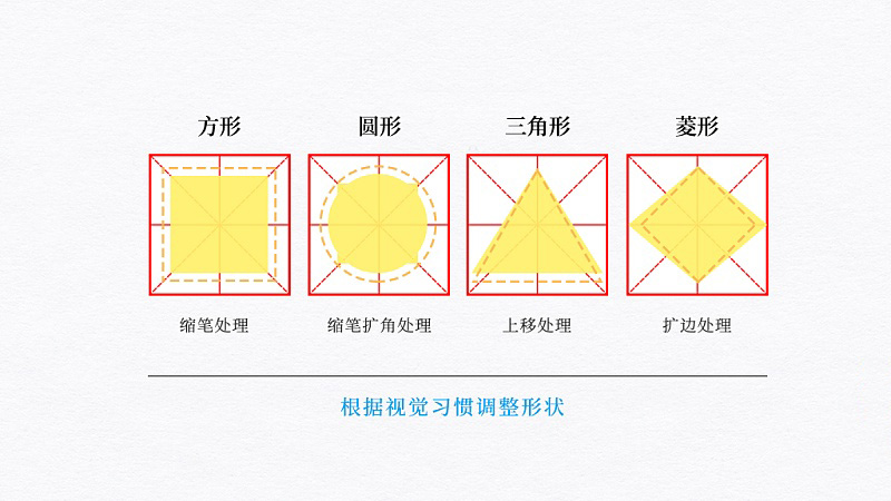 如果把字面形狀按照視覺習(xí)慣歸類為規(guī)則的幾何圖形,我們可以大致把漢字歸納為方形、圓形、三角形和菱形4種典型形狀,針對(duì)這四種類型作相應(yīng)處理,就能做到字體在視覺上字面保持一致。
