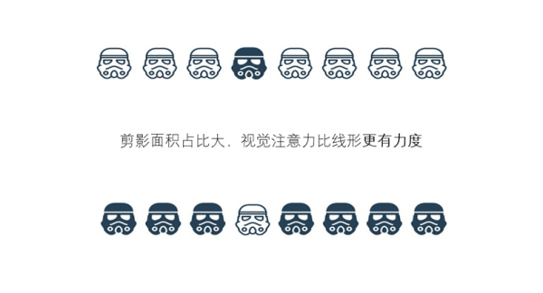 舉個例子,在一排空心圖標(biāo)中插入一個實(shí)心的,和一排實(shí)心圖標(biāo)中放置一個空心的,對比之下就會發(fā)現(xiàn),實(shí)心的圖標(biāo)相比較空心的而言,視覺注意力更有力度,讓用戶更容易抓到重點(diǎn)。