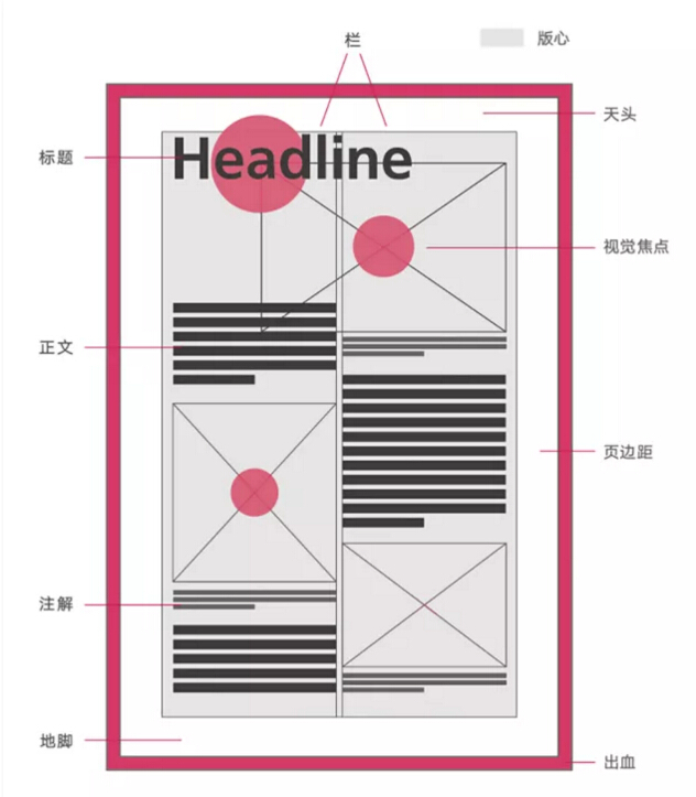 下面是一張版式設計要素的基本構成圖示,該圖可以讓我們更加直觀地了解版面的構成,同時也方便了我們在實際設計場景中靈活地變通和使用。