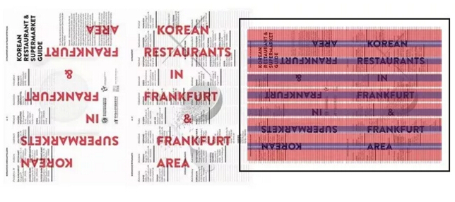 德國法蘭克福的韓國餐廳指南傳單設計,網格使版式設計達到了雙重效果,一方面有條理地展示了法蘭克福各條街道上的韓國餐廳,一方面令版式引人注目,富有生氣。