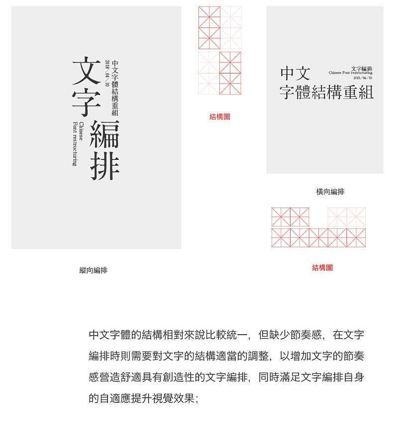 在設(shè)計(jì)中文字編排矩形化是使用最為普遍的方式,但也是集文字的自適應(yīng)和它適應(yīng)以及文字結(jié)構(gòu)為一身的綜合使用,是通過局部反應(yīng)整體的直接表現(xiàn),其在畫面中主要可以對視覺產(chǎn)生平衡的作用,不管是橫向和縱向的左對齊還是右對齊都可以以矩形作為衡量的工具,同時也與中文造字的基礎(chǔ)不謀而合;